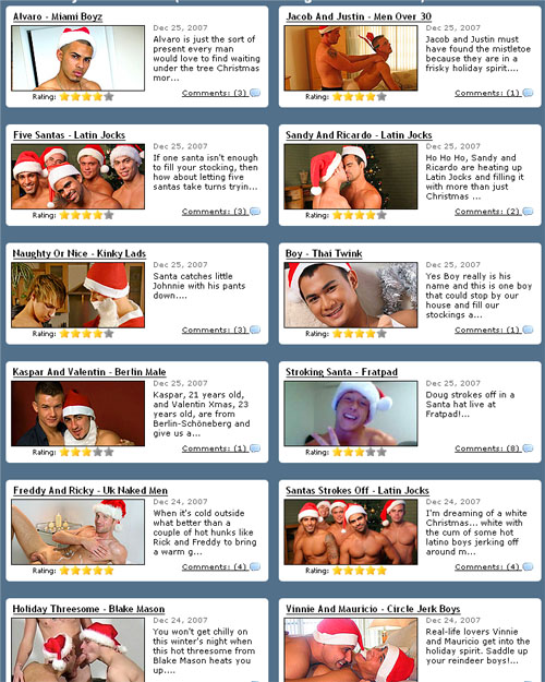 Last year I thought that Christmas themed porn was funny…   but this year everyone is doing it!  The snap above is just a sample of the sites throwing on santa claus hats and mostly hamming it up for the camera.   I’m mostly distracted by Alvaro from Miami Boys…  what a hottie!   I have a huge thing for those latino boys…  you would very rarely see them here in Australia.Now that Christmas is finished I’m busy getting ready for a trip down to the surf coast tomorrow with a couple of my mates.   It seems like forever since I last got down to the beach.The screen grab above was taken from JustUsBoys.com.